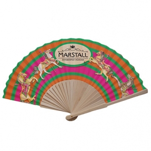 Mit diesem Holzfächer im Marstall Design behält man selbst an heißen Wiesn-Tagen einen kühlen Kopf. Material: Holz, Polyester. Grösse ausgeklappt: L 35cm, B 35cm.